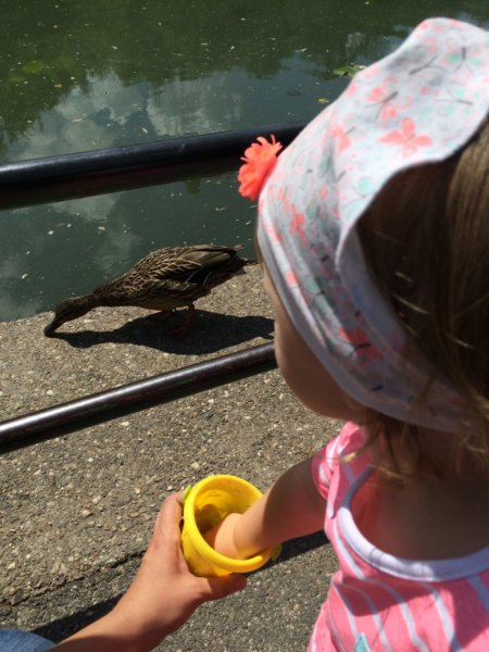 A helyi kis csónakázó tó felé vettük az irányt. Persze nem fürdési céllal, hanem az itteni állatvilág felkutatásáért. A tó körül van lehetőség 100 Ft-ért állateledelt venni. Külön felhívják rá a figyelmet, hogy ne kenyeret dobjunk a tóba. Több, mint egy felnőttmaroknyi tápot ad a gép, így megtöltöttük a kis homokozó vödrünk és abból dobáltuk komótosan. Még egy másik kisfiúnak is tudtunk adni, hogy Ő se maradjon ki a mókából. Sajnos a lendület nem mindig volt elég nagy Flórától, így több jutott kintre, mint bentre, de ezzel azt értük el, hogy az éhes kacsák kimerészkedtek a tóból csemegézni. 🦆